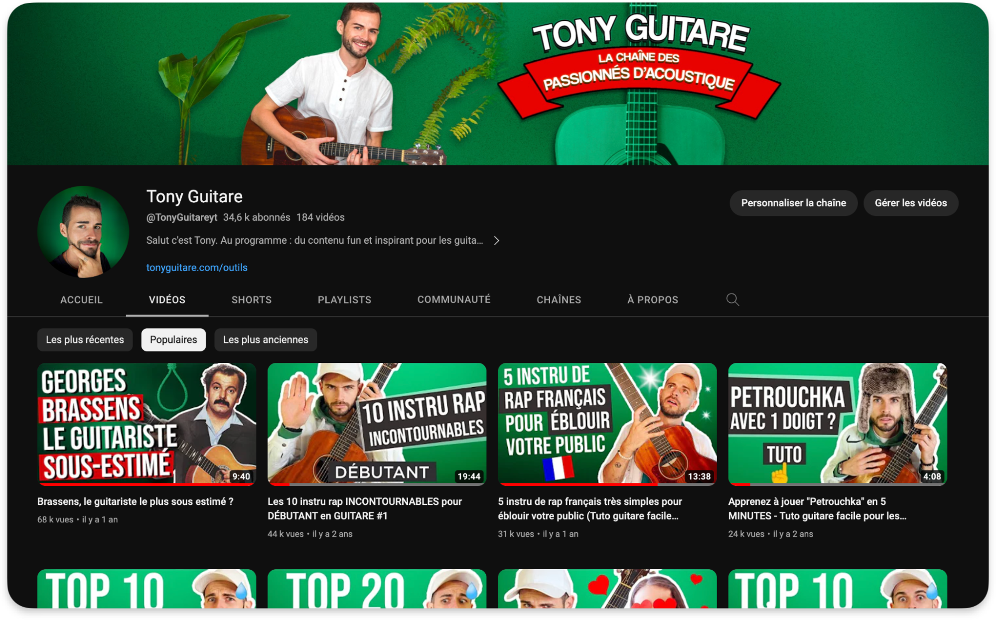 Les difficultés et les obstacles que j'ai rencontrés avec la guitare acoustique m'ont emmené à créer Tony Guitare en janvier 2021. Et la chaîne YouTube a touché plus de 14 millions de personnes en 2 ans. Aujourd'hui, Tony Guitare a 35k abonnés.